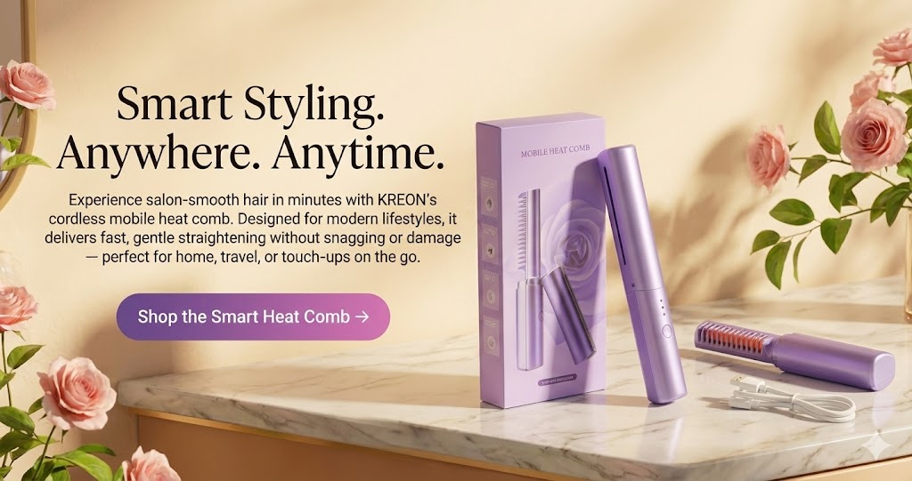 The KREON Portable Mini Hair Straightener is designed for quick touch-ups and everyday styling with a cordless rechargeable design and controlled heat technology that’s gentle on hair.